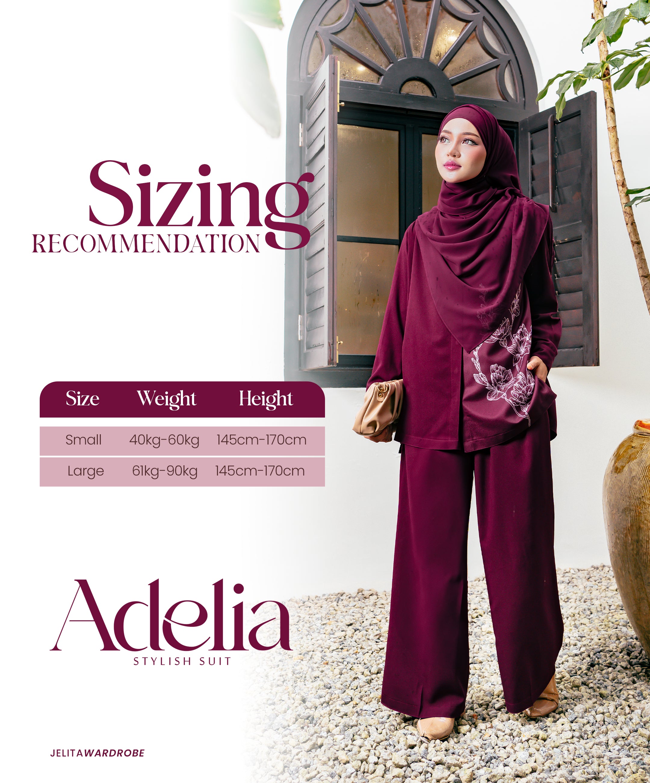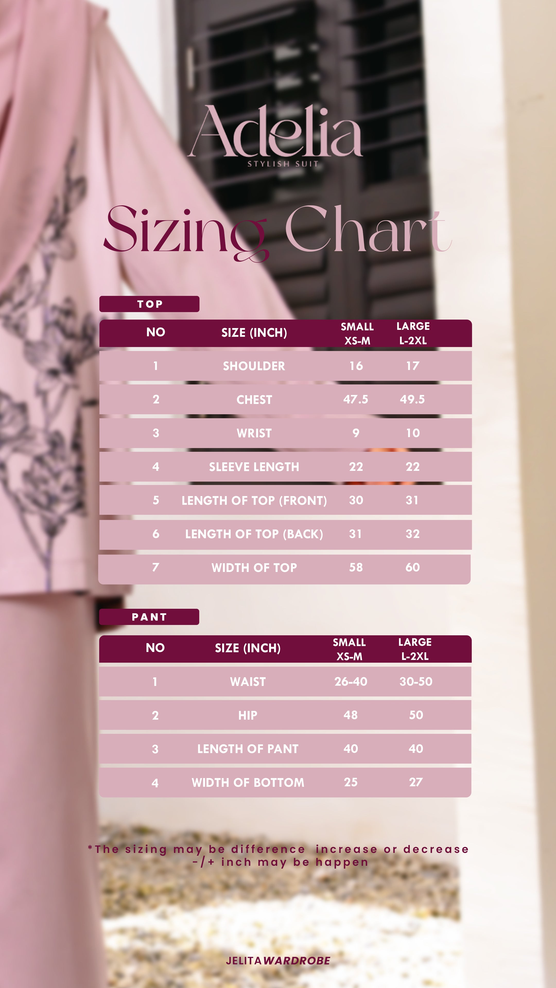 Ukuran setiap koleksi adalah berbeza, sila rujuk carta ukuran saiz. Disebabkan faktor pembuatan, ukuran yang dinyatakan ada variasi perbezaan lebih kurang 1 inci dari yang dinyatakan