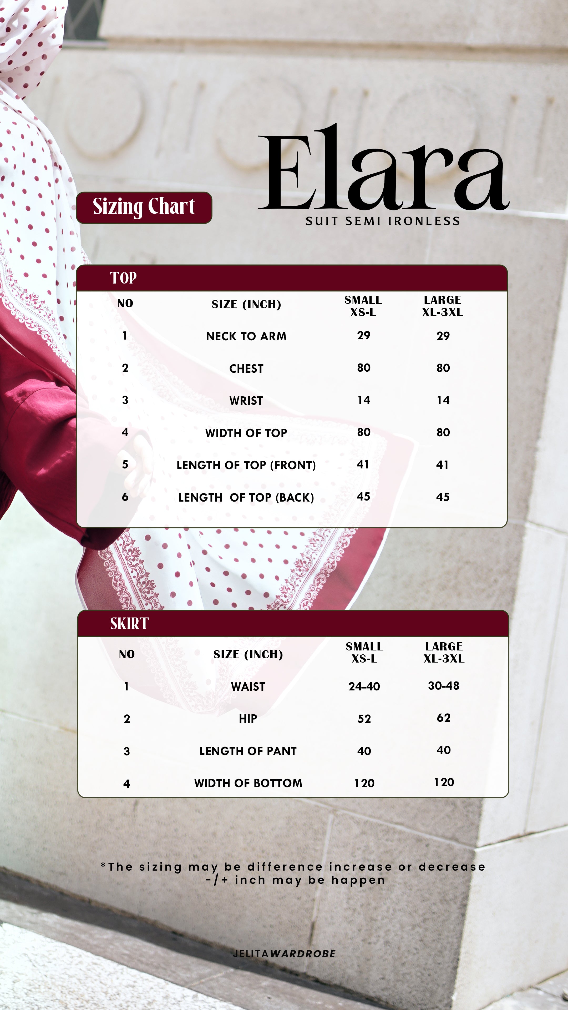Ukuran setiap koleksi adalah berbeza, sila rujuk carta ukuran saiz. Disebabkan faktor pembuatan, ukuran yang dinyatakan ada variasi perbezaan lebih kurang 1 inci dari yang dinyatakan.