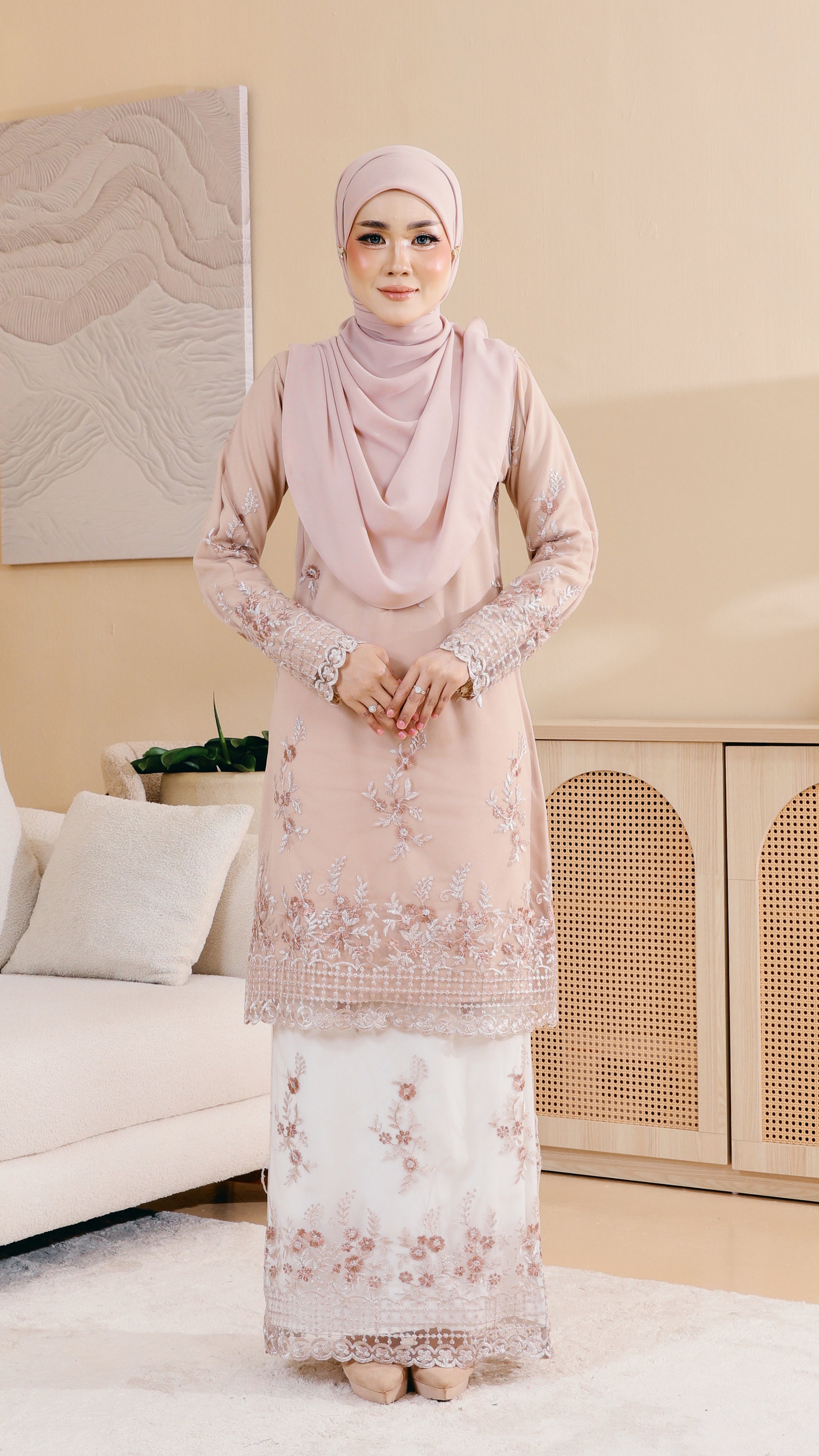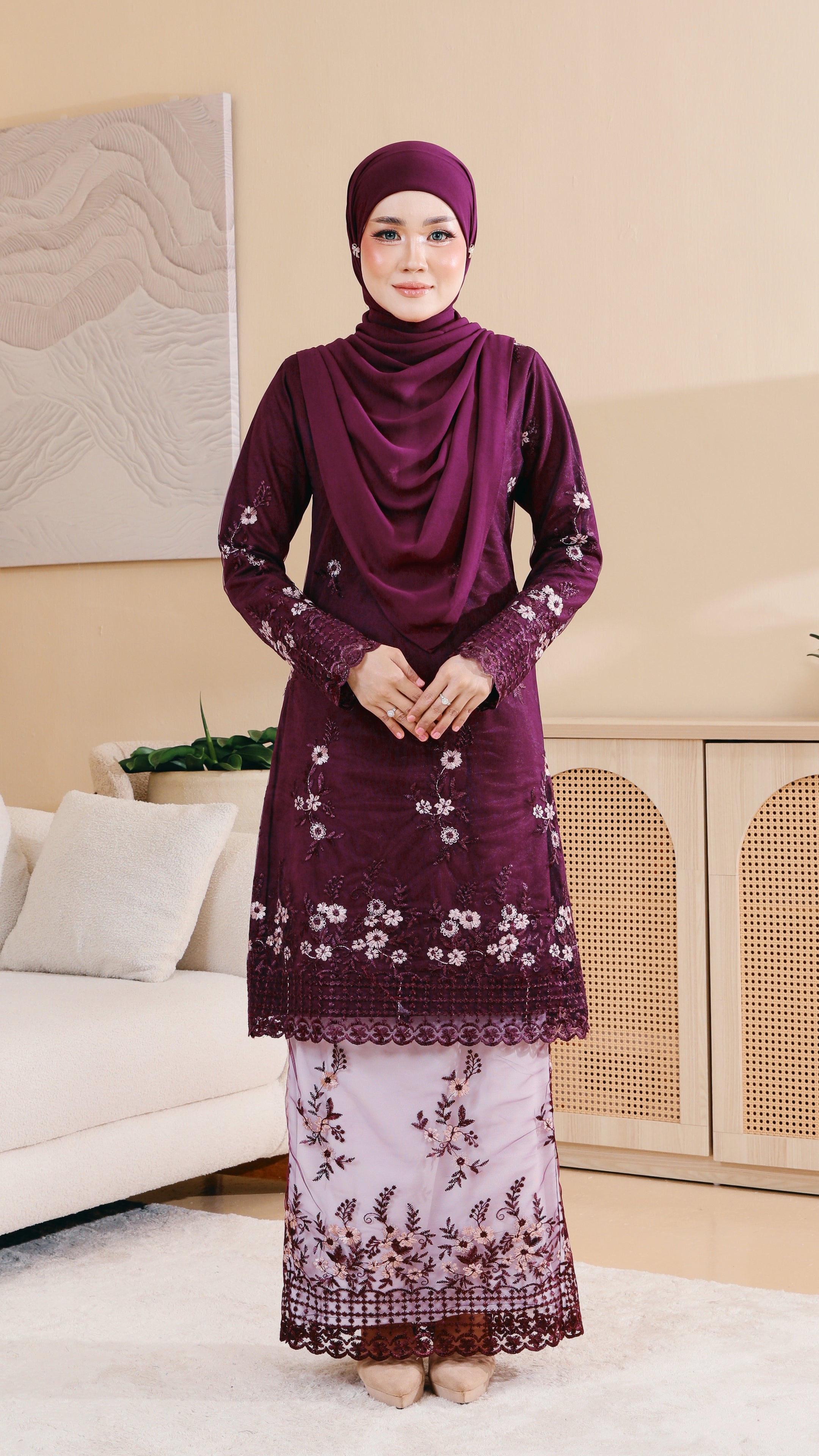 Kurung Ashley – exudes elegant charm through the combination of luxurious materials and timeless modern design. Crafted from soft, lightweight, and breathable Dubai Como Crepe, paired with delicate and exclusive floral-embroidered Tulle Lace, it becomes the perfect choice for women who value style, comfort, and refined detailing in every look.
