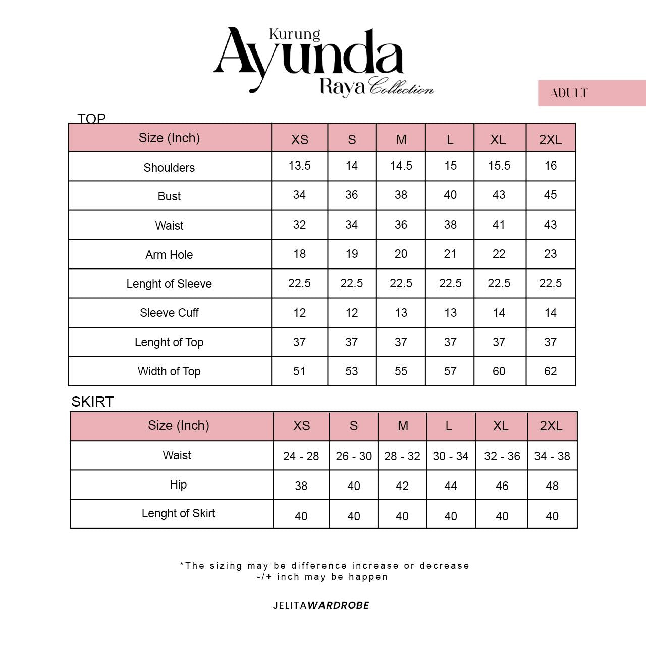 Ukuran setiap koleksi adalah berbeza, sila rujuk carta ukuran saiz. Disebabkan faktor pembuatan, ukuran yang dinyatakan ada variasi perbezaan lebih kurang 1 inci dari yang dinyatakan.