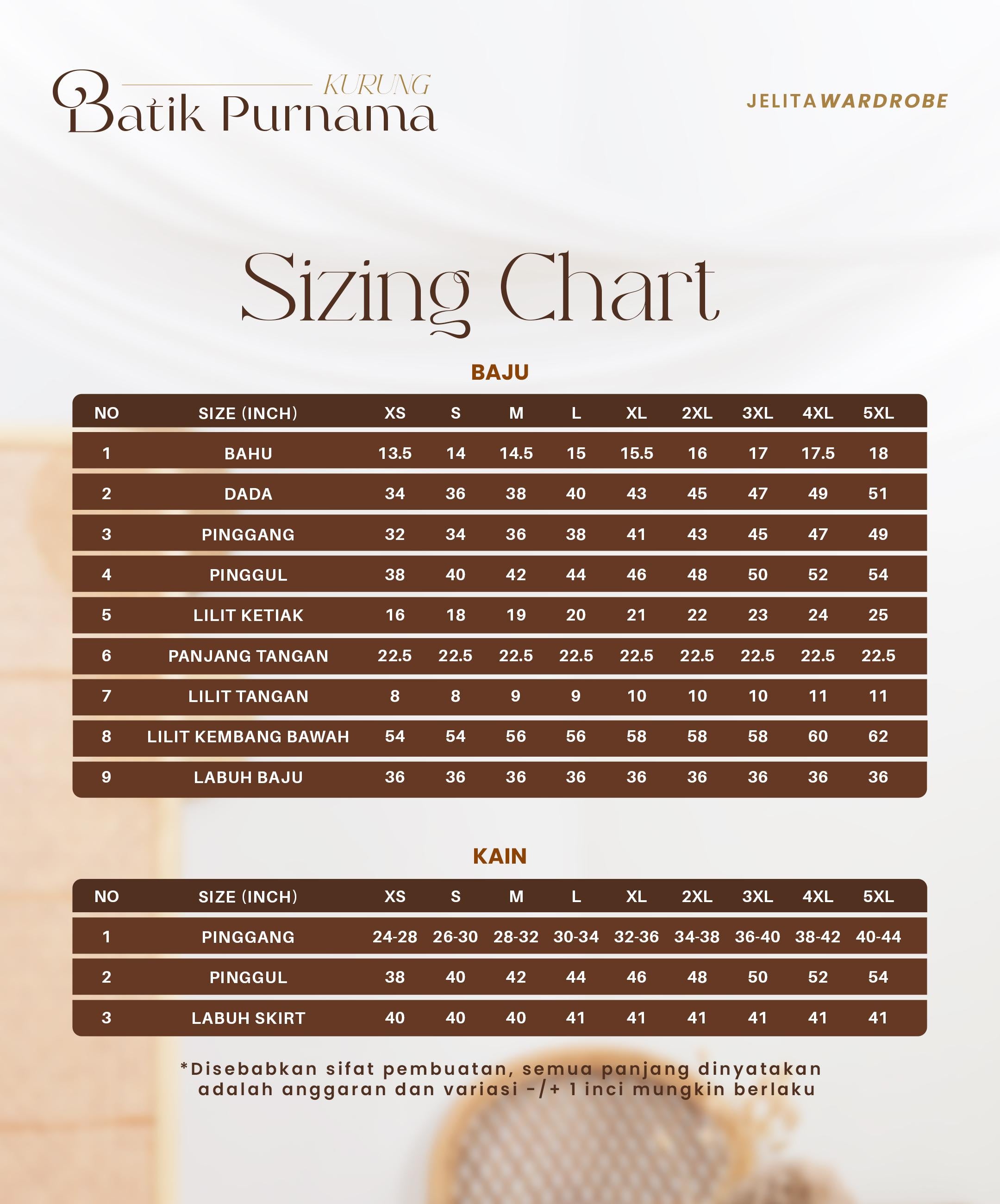Ukuran setiap koleksi adalah berbeza, sila rujuk cartau kuran saiz. Disebabkan faktor pembuatan,