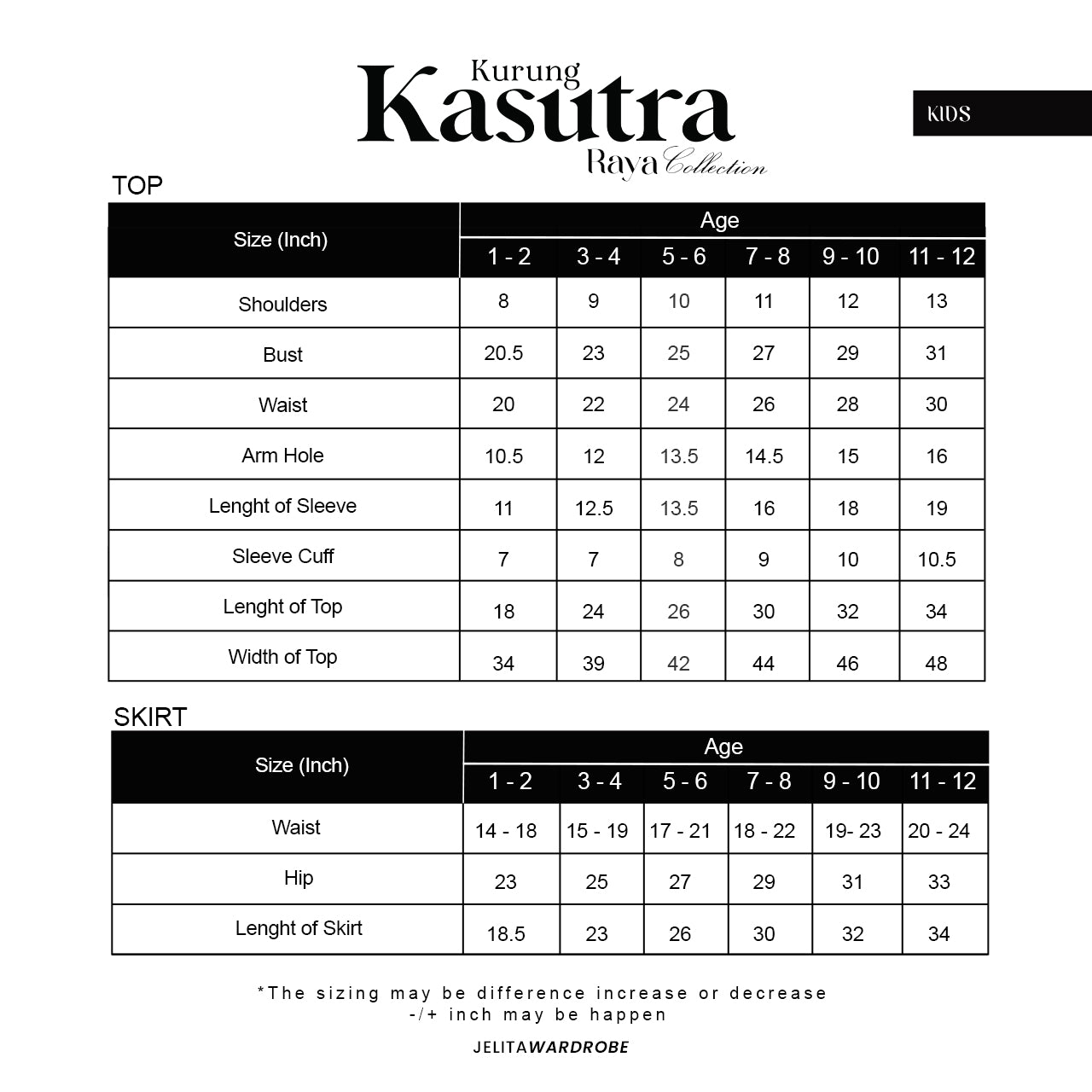 Ukuran setiap koleksi adalah berbeza, sila rujuk carta ukuran saiz. Disebabkan faktor pembuatan, ukuran yang dinyatakan ada variasi perbezaan lebih kurang 1 inci dari yang dinyatakan.