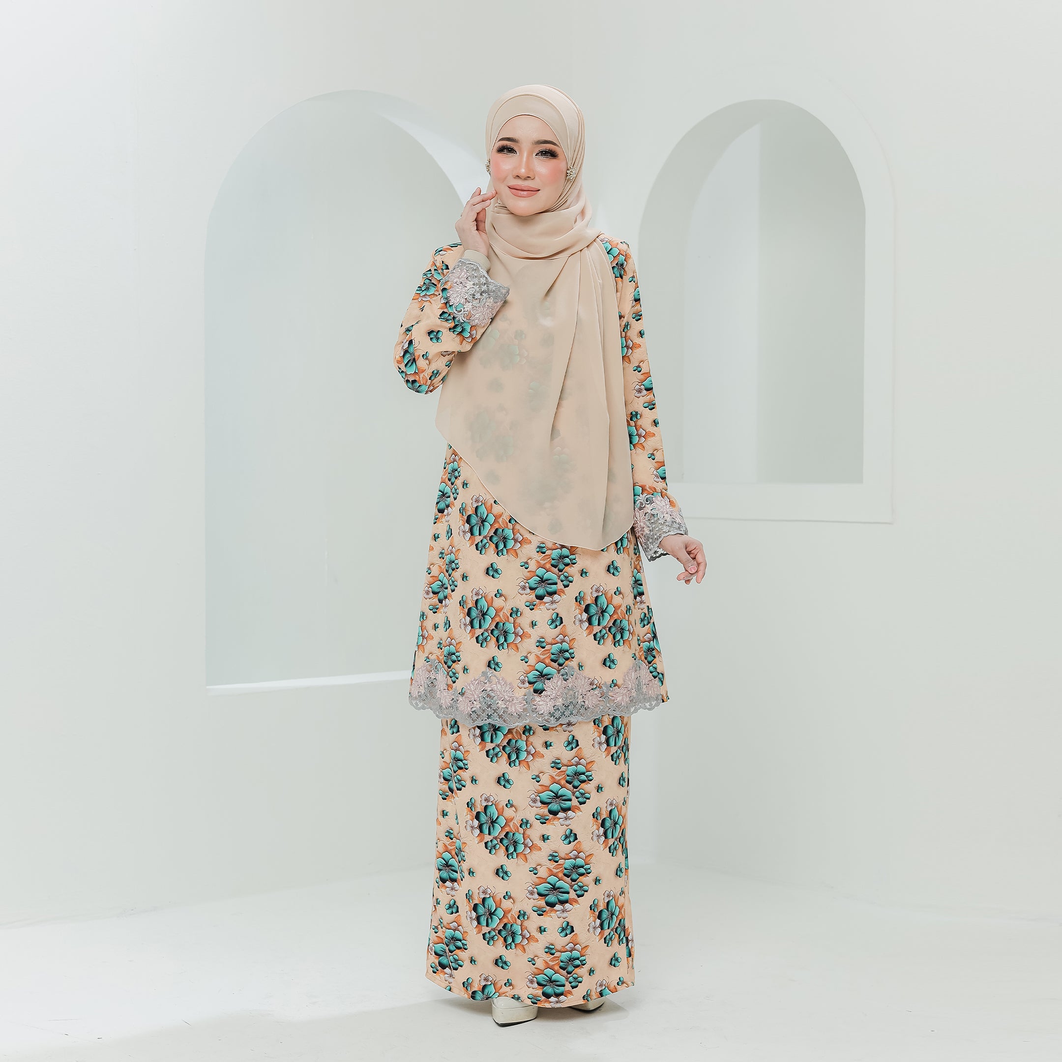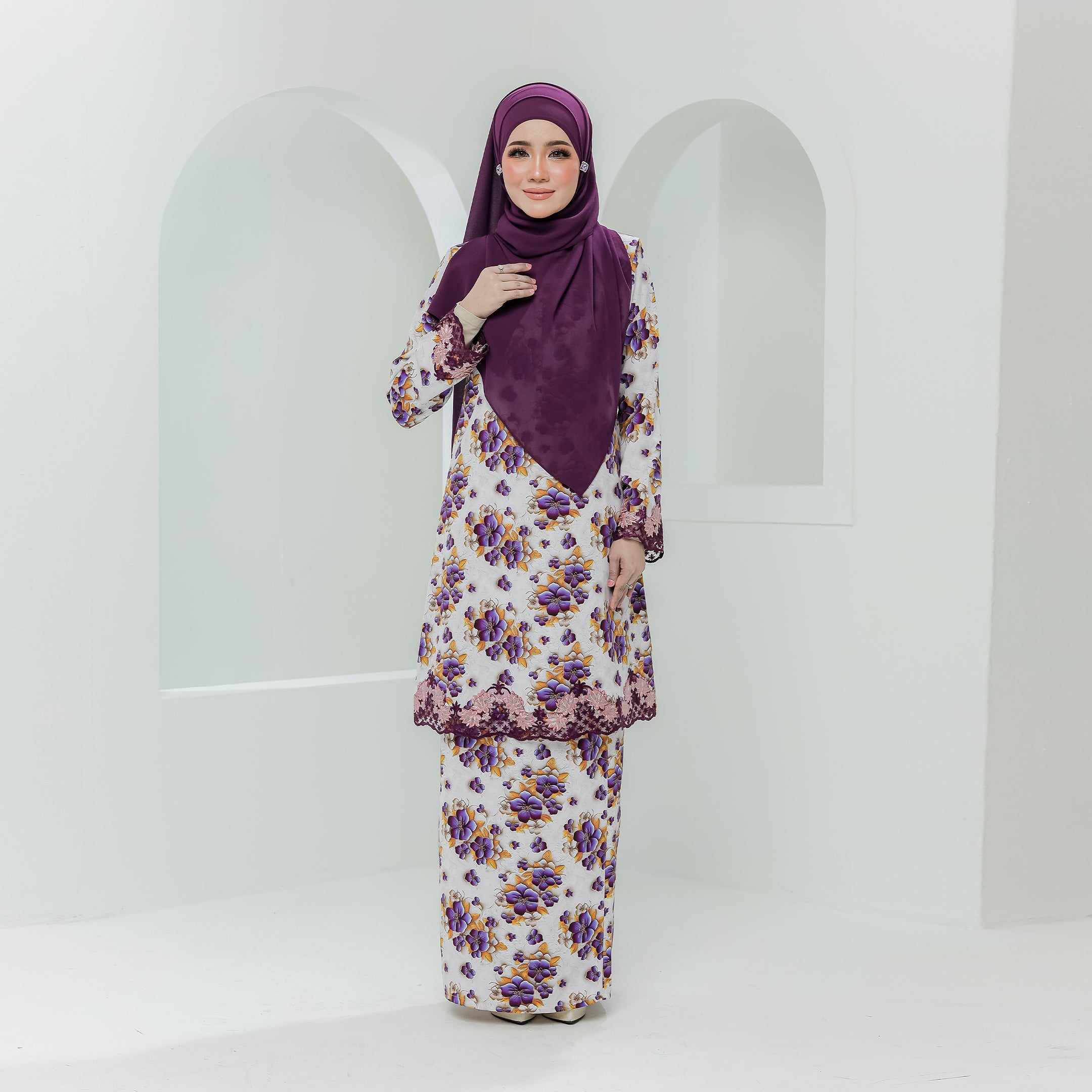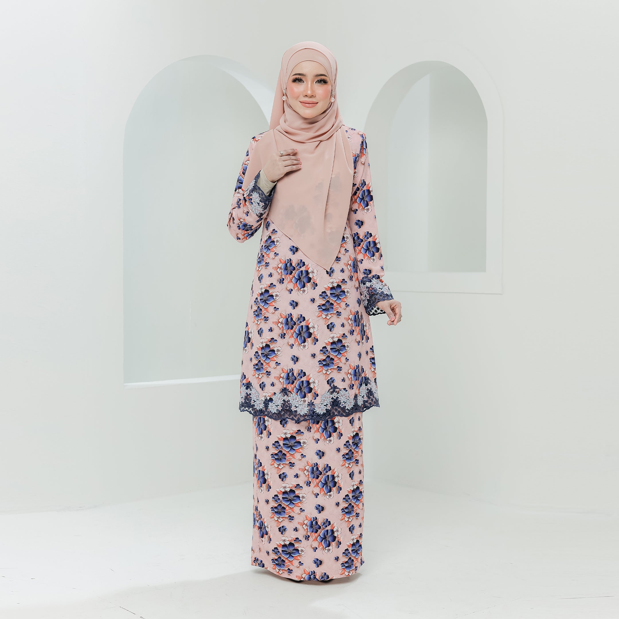 · Dihiasi lace bermotifkan floral pada hujung tangan dan bahagian depan baju