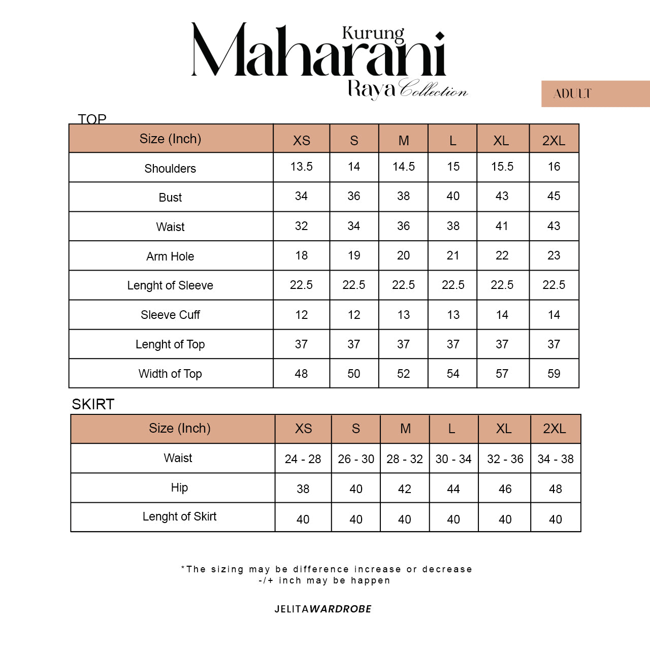 Ukuran setiap koleksi adalah berbeza, sila rujuk carta ukuran saiz. Disebabkan faktor pembuatan, ukuran yang dinyatakan ada variasi perbezaan lebih kurang 1 inci dari yang dinyatakan.