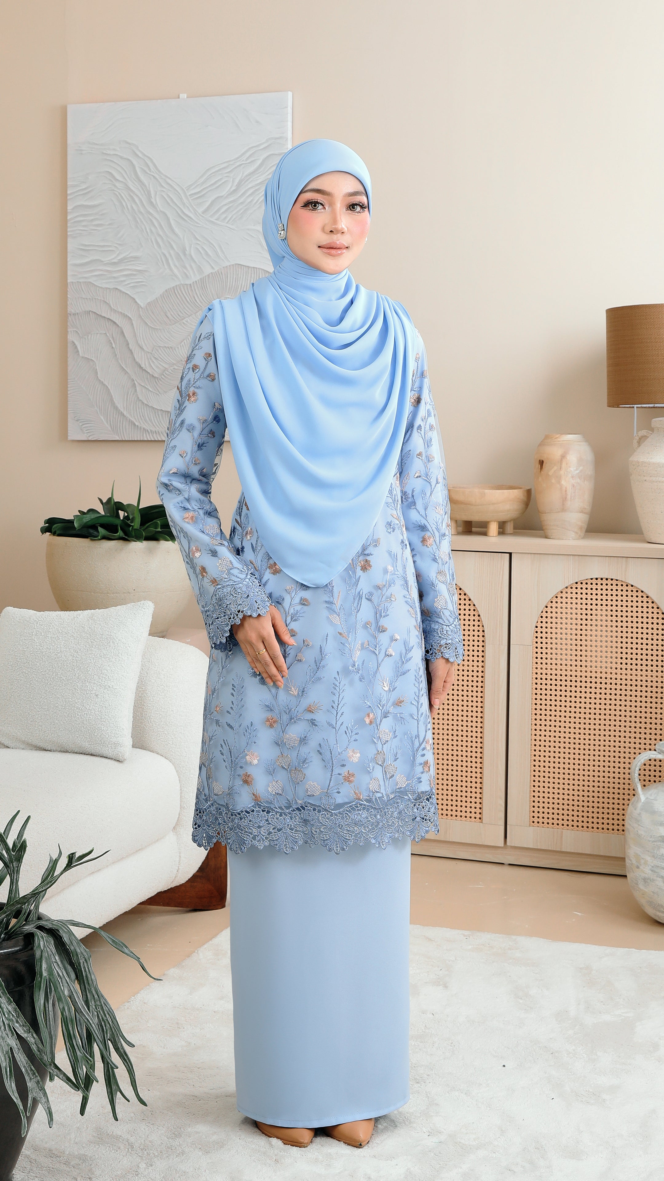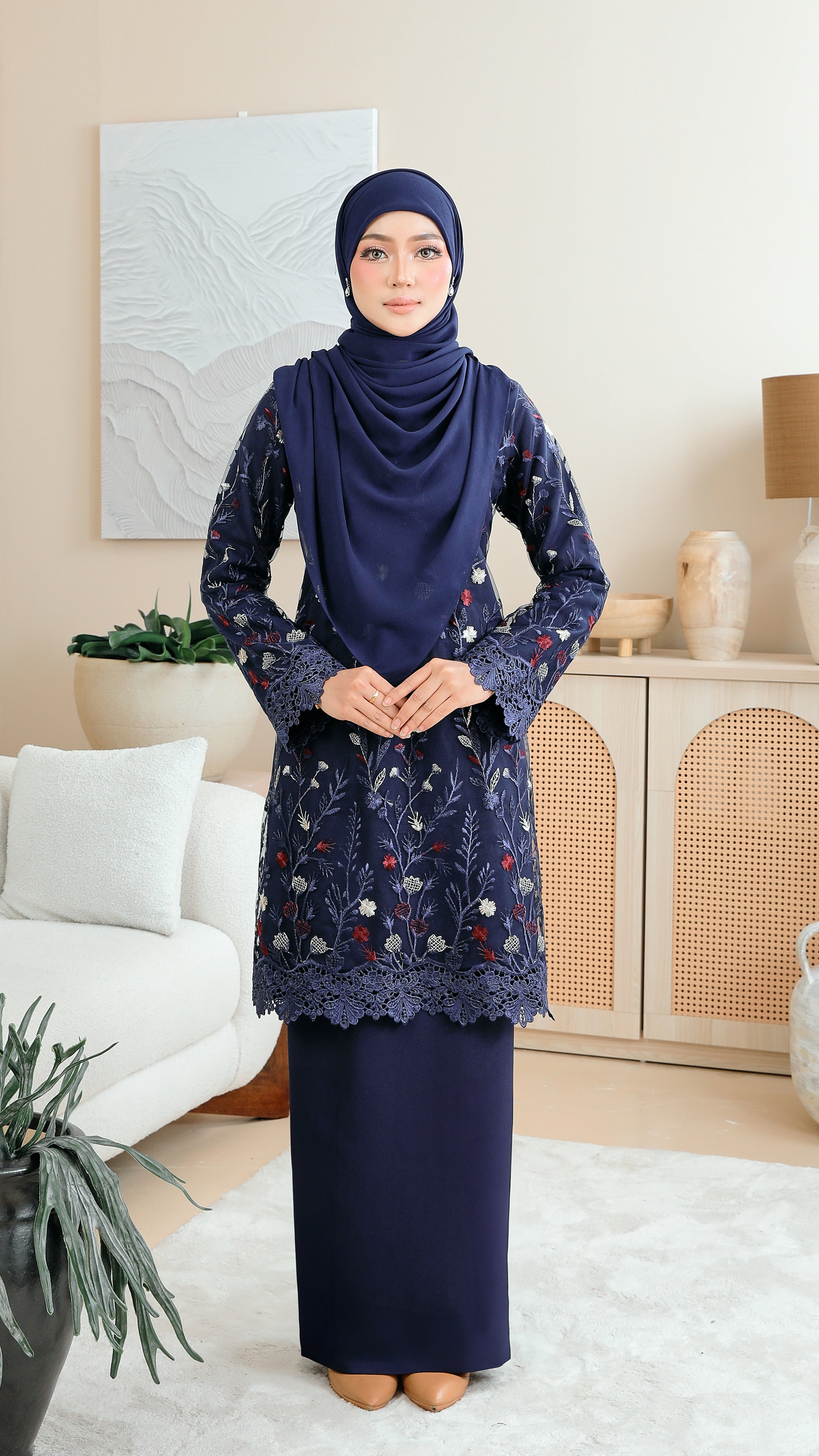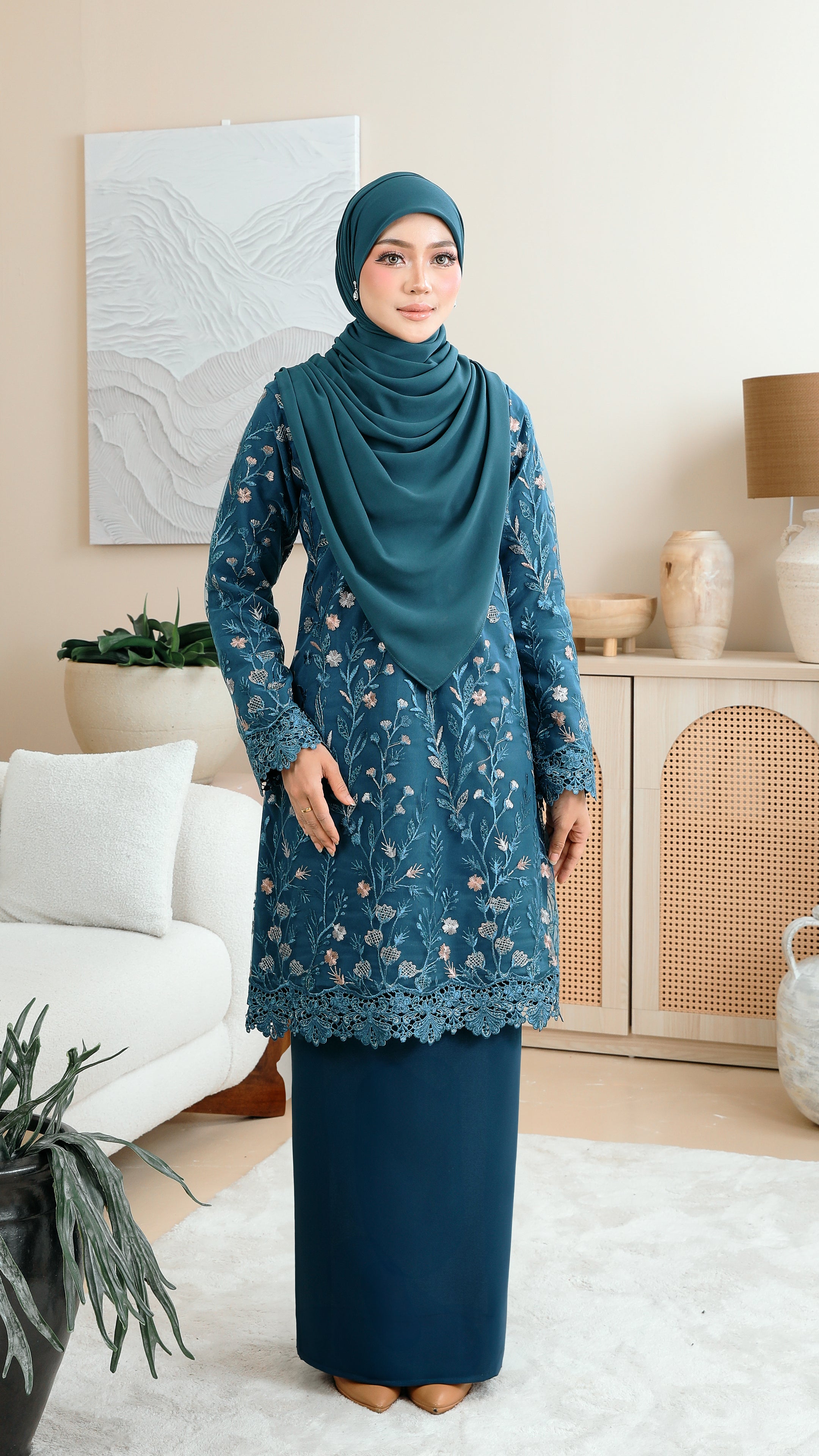 Made from lightweight Dubai Crepe, this comfortable outfit features beautiful floral lace and elegant Prada Lace trims on the sleeves and hem. Its loose and straight design gives a modest look, perfect for both formal and casual events.