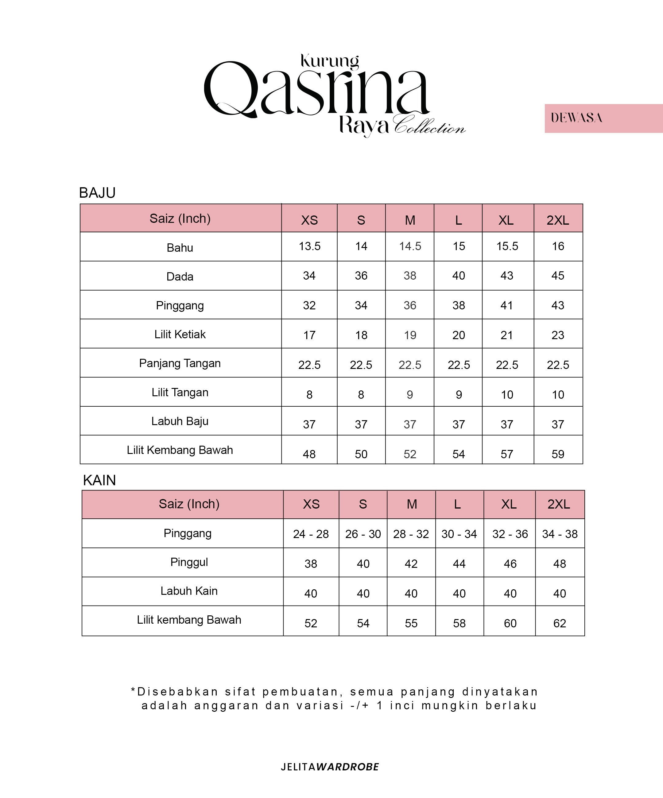 Ukuran setiap koleksi adalah berbeza, sila rujuk carta ukuran saiz. Disebabkan faktor pembuatan, ukuran yang dinyatakan ada variasi perbezaan lebih kurang 1 inci dari yang dinyatakan.