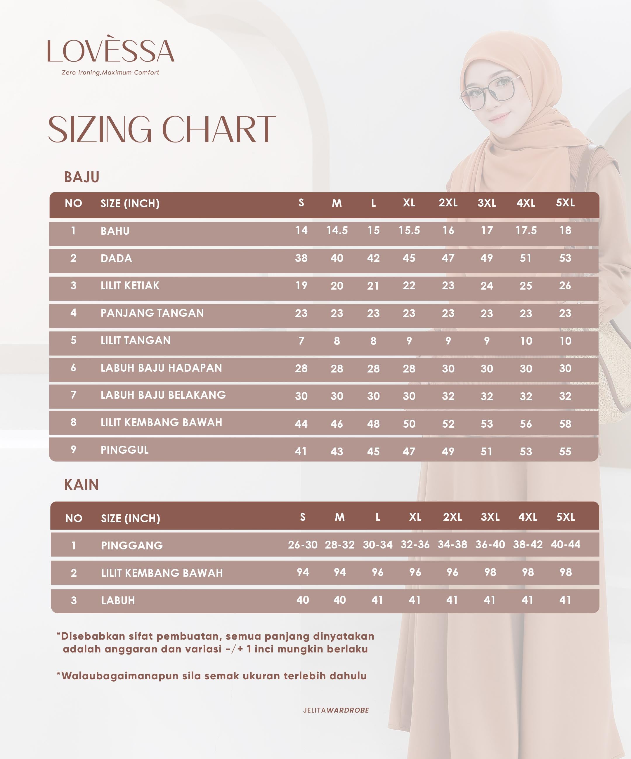 Ukuran setiap koleksi adalah berbeza, sila rujuk cartau kuran saiz. Disebabkan faktor pembuatan, ukuran yang dinyatakan ada variasi perbezaan lebih kurang 1 inci dari yang dinyatakan